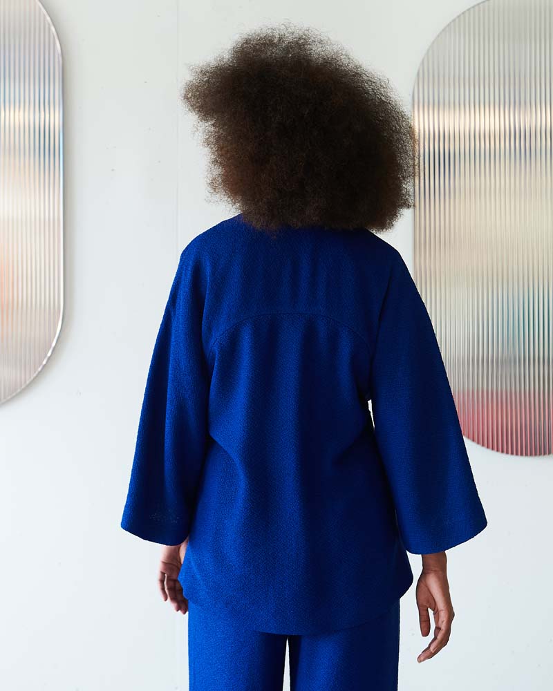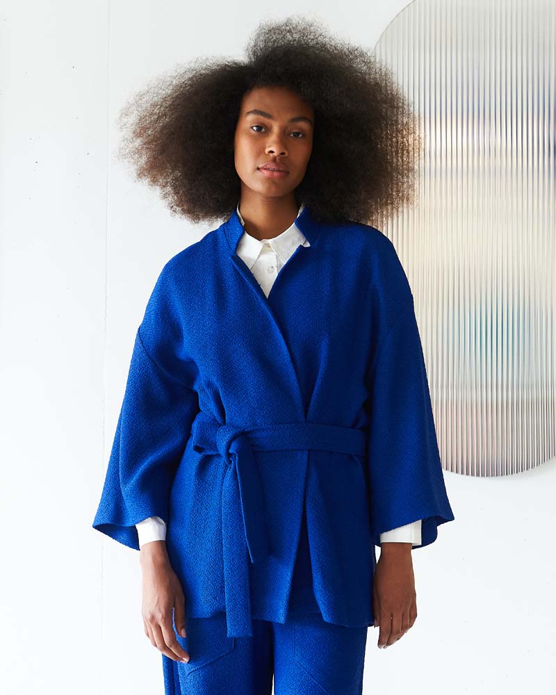 Sophisticated kimono jacket in textured woven fabric with wrap belt detail and draped shoulder construction.