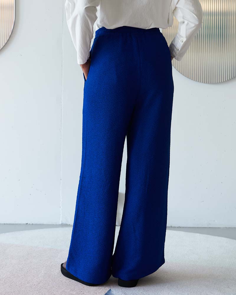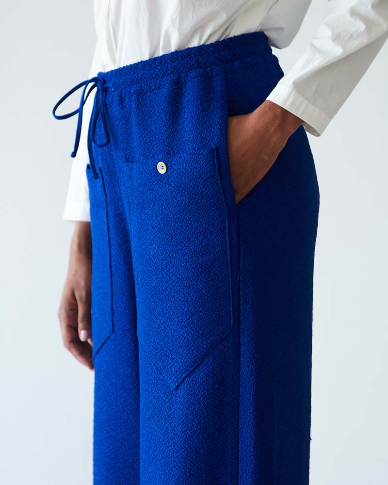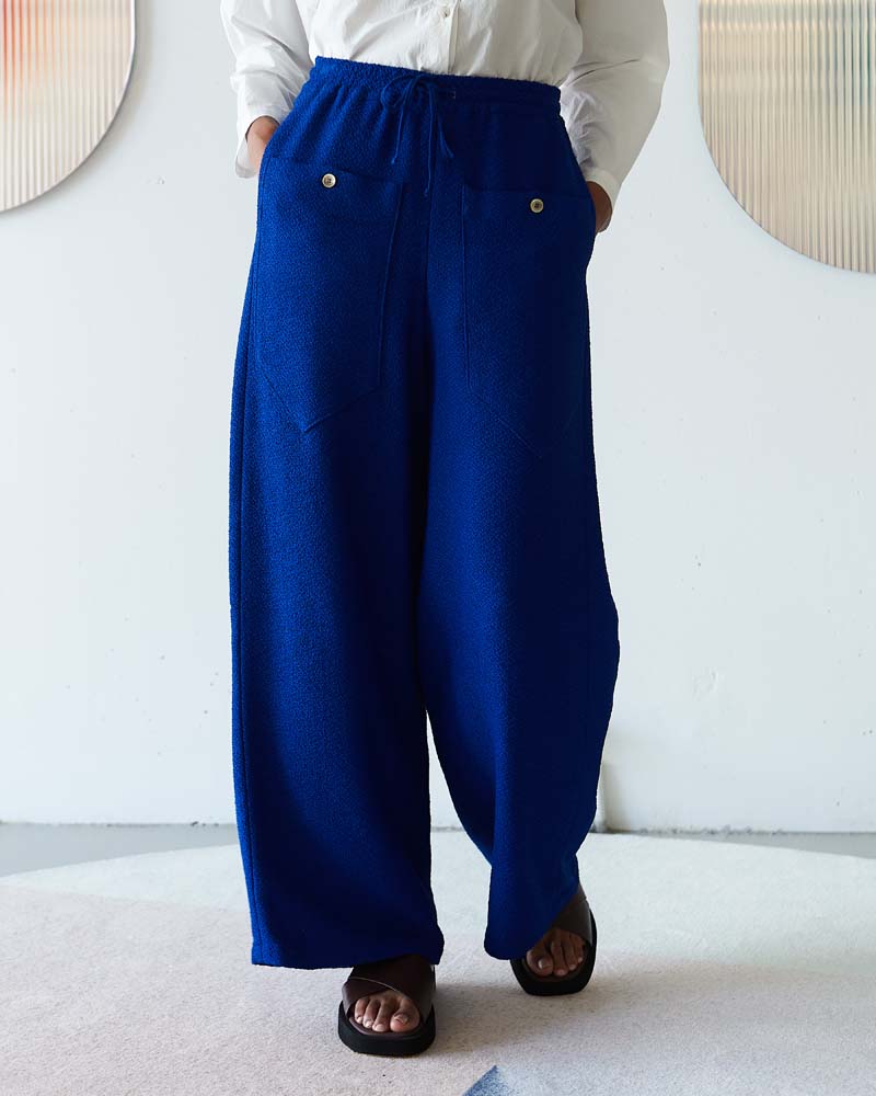 Wide leg high waist trousers in textured woven fabric with large pockets, side pockets, and drawstring detail.