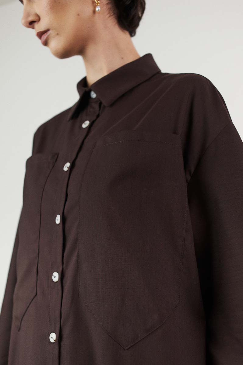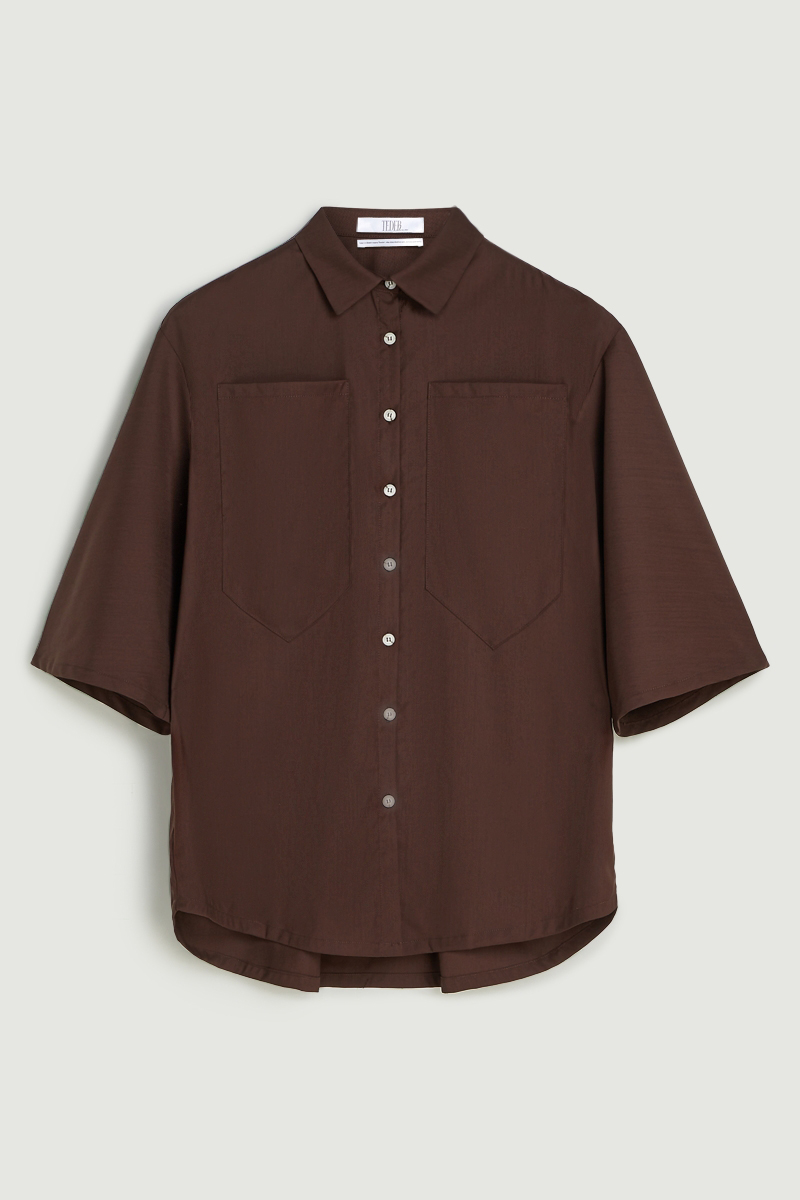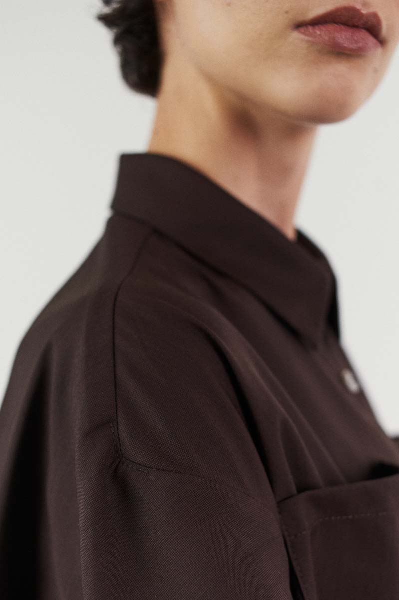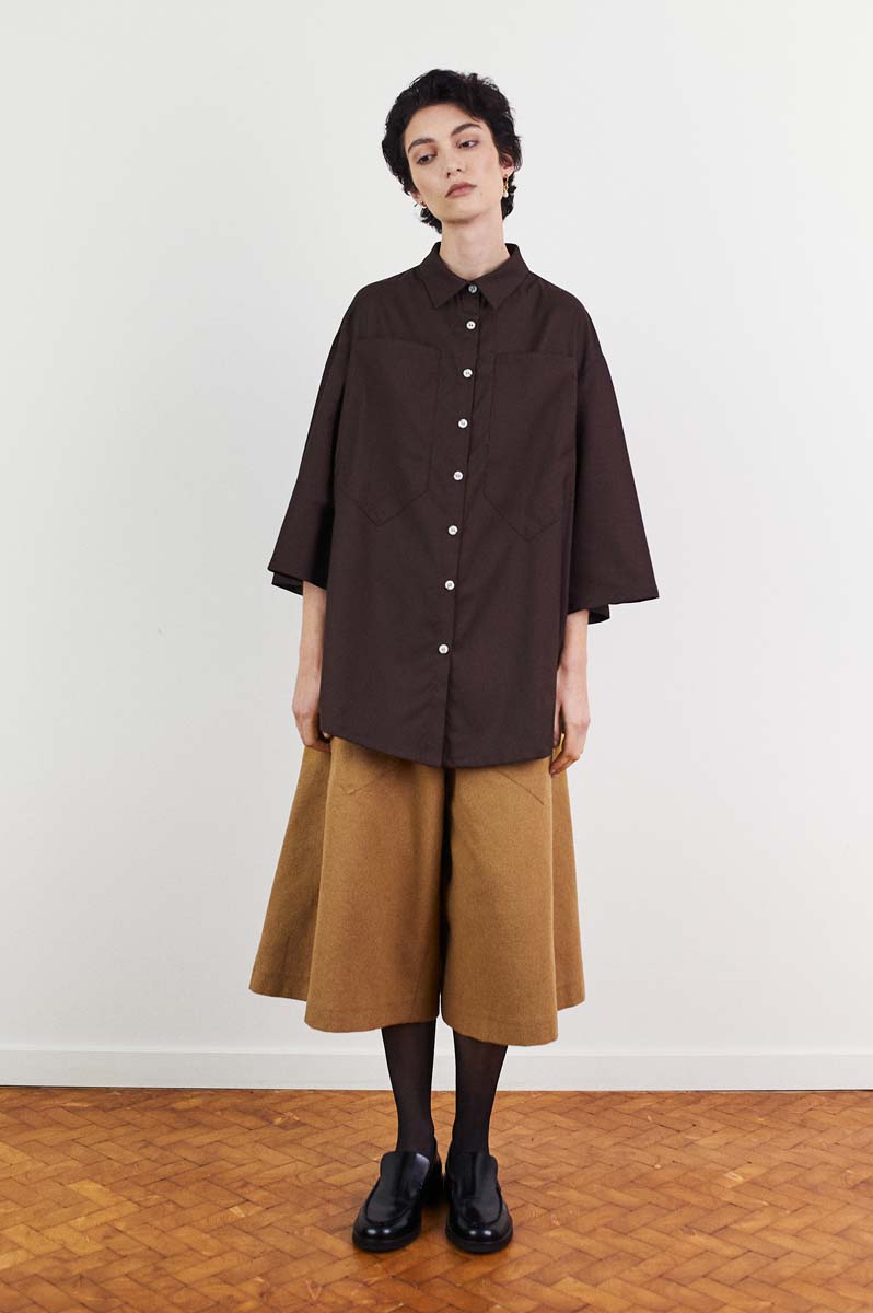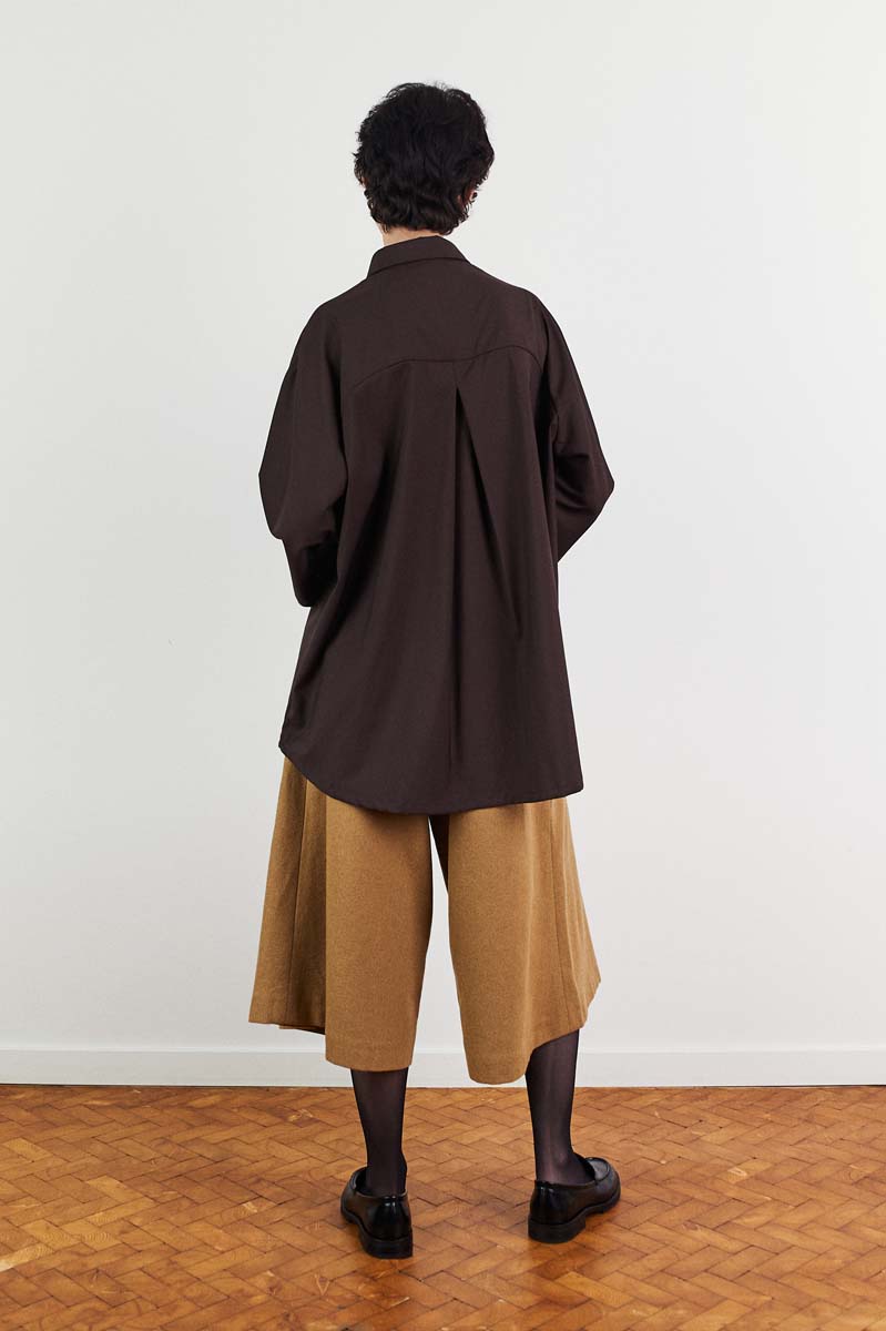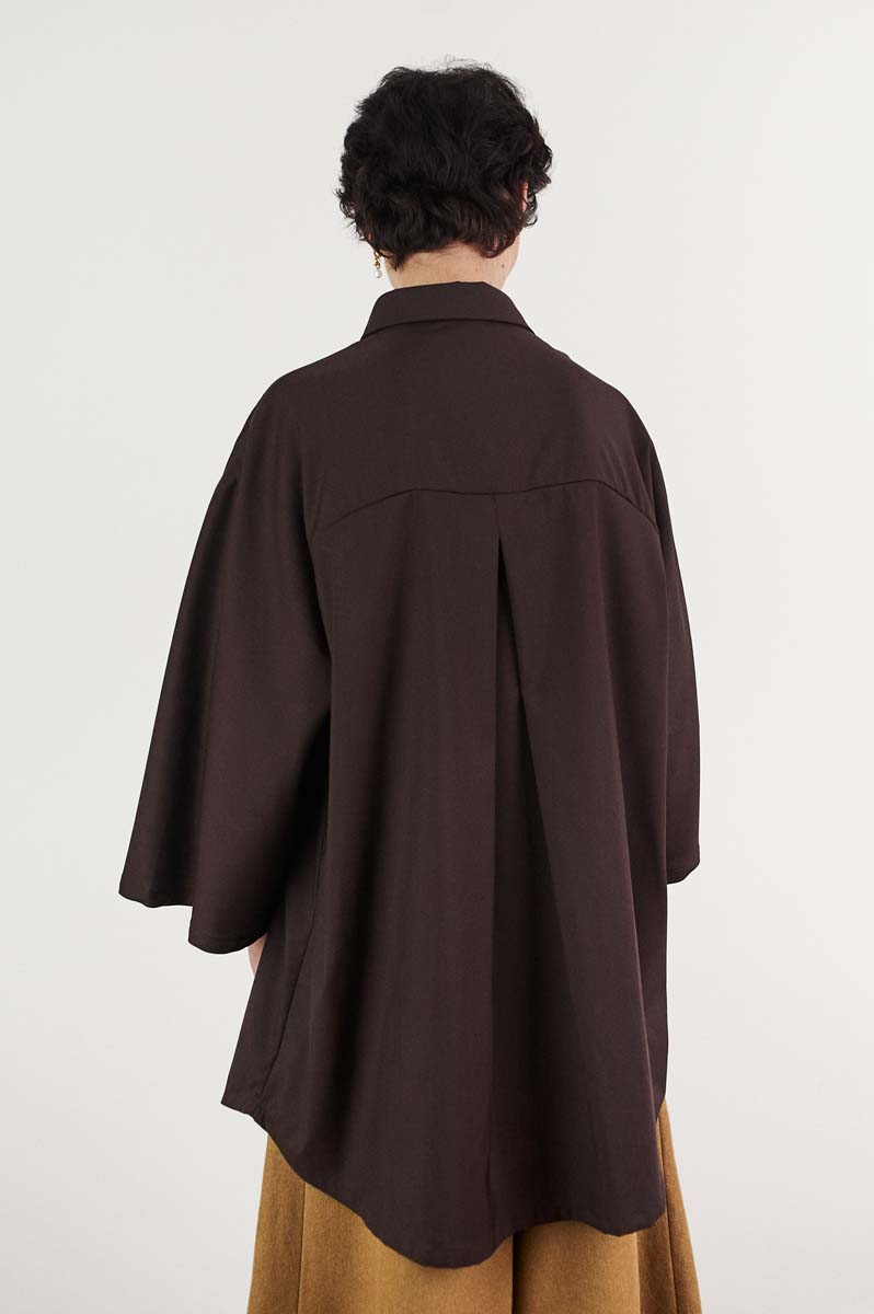 Style: Oversized shirt in wool with kimono sleeves and enlarged chest-pocket